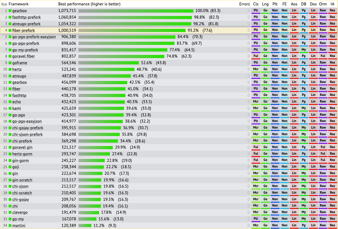 Fiber handled 1,000,519 responses per second with an average latency of 0.5 ms.